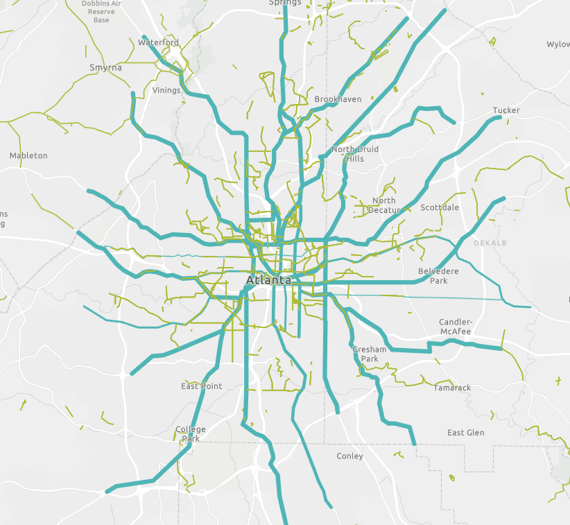 A conceptual map of a future Atlanta cycling network, overlaid on existing cycling infrastructure. (Image: Aurora Innovative Solutions)