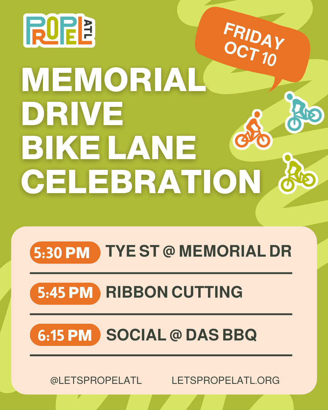 We'll meet at the corner of Tye Street SE and Memorial Drive at 5:30 p.m., cut the ribbon at 5:45 p.m., then meet at Das BBQ for a social hour, where participants will get 25 percent off their order thanks to Das BBQ!