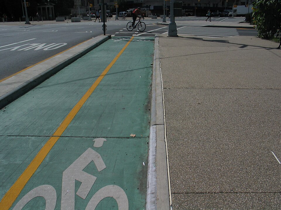 Examples of traffic calming: a protected bike lane (left) and a bulb-out. Photos: GK tramrunner RU (L) and Adrian Pingstone/Wikimedia Commons