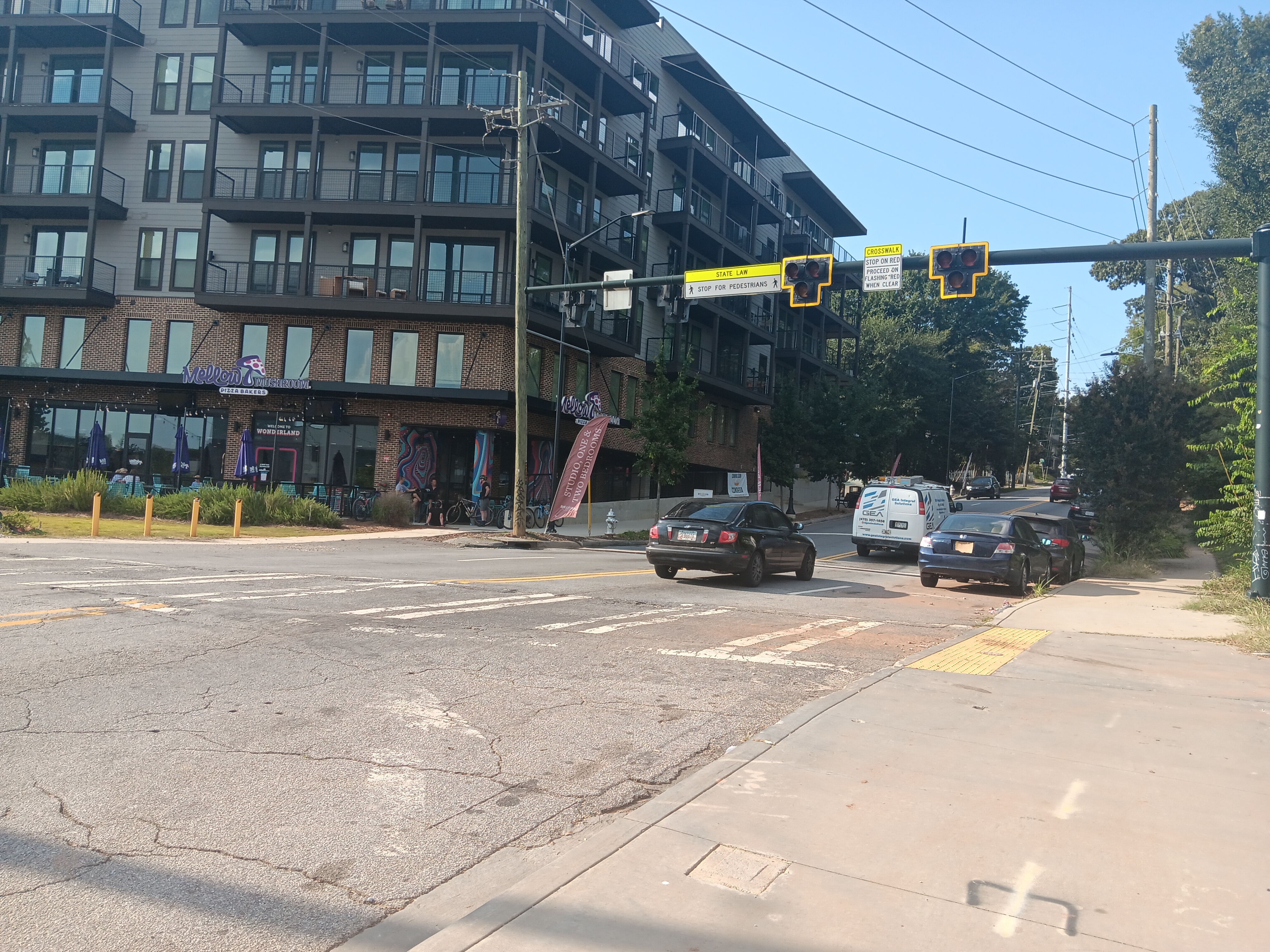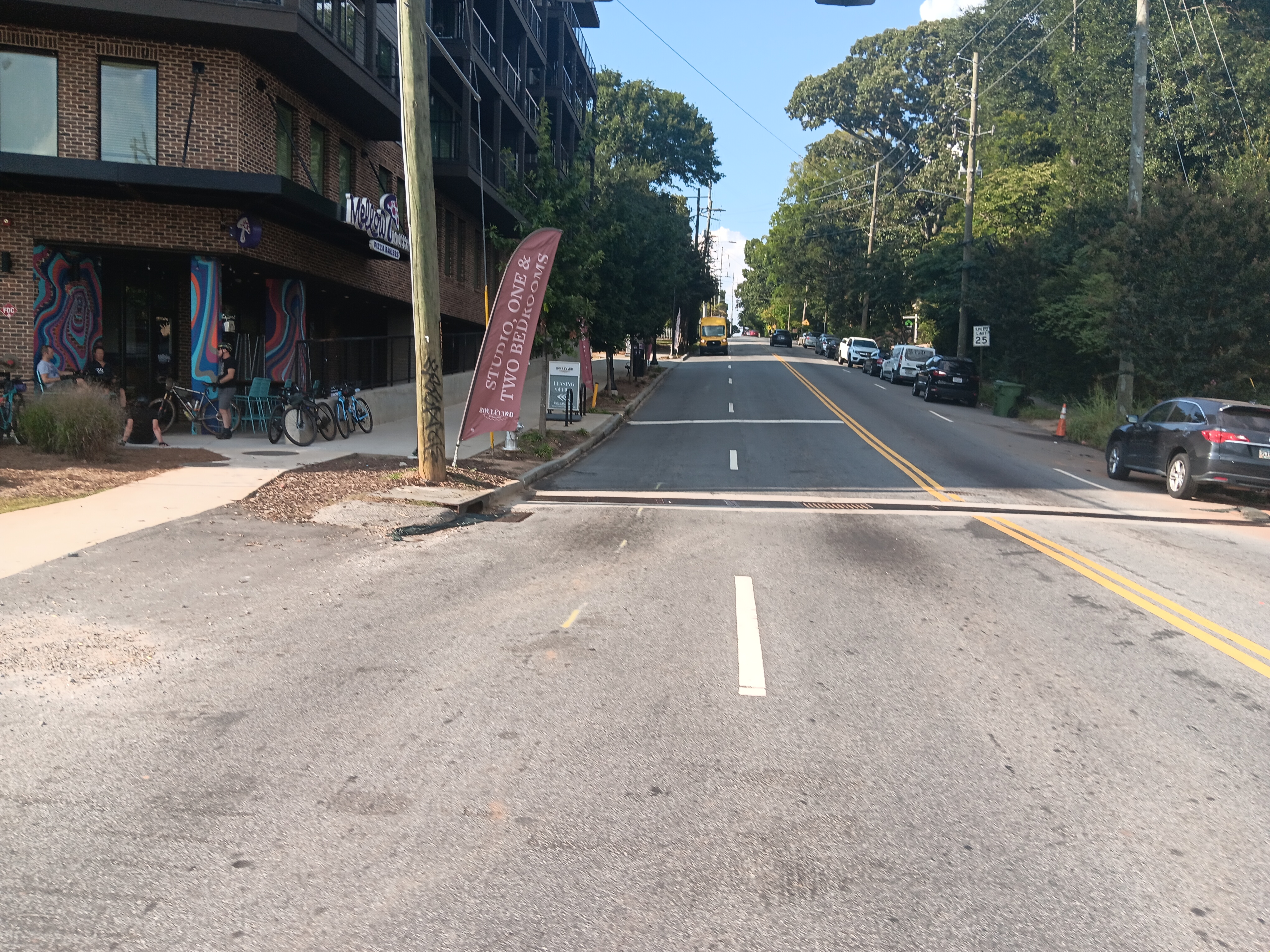 Looking north on Boulevard, where four travel lanes turn into three, with street parking now used by restaurant patrons as much as residents. Photo: Propel ATL
