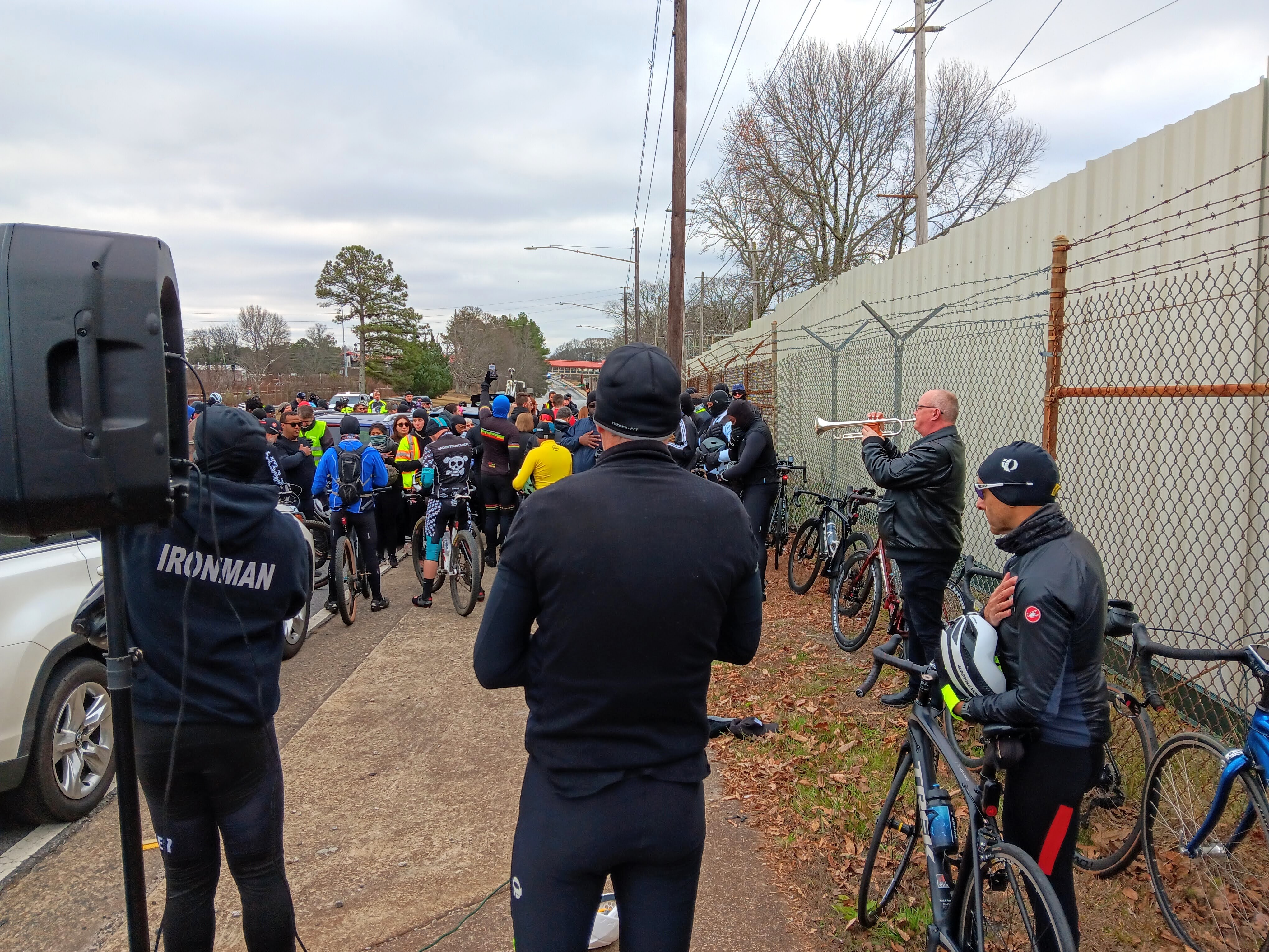 The crash that took Tom’s life galvanized the Atlanta cycling community. Despite morning temperatures in the 30s, close to 800 cyclists turned out to the Lee & White complex in Southwest Atlanta on Dec. 30 for a memorial ride that retraced the route of that WBL group. The ride paused at the site where Tom lost his life in order for a special ceremony to take place. Taps was played to honor his military service, while a “ghost bike” was placed as a memorial.